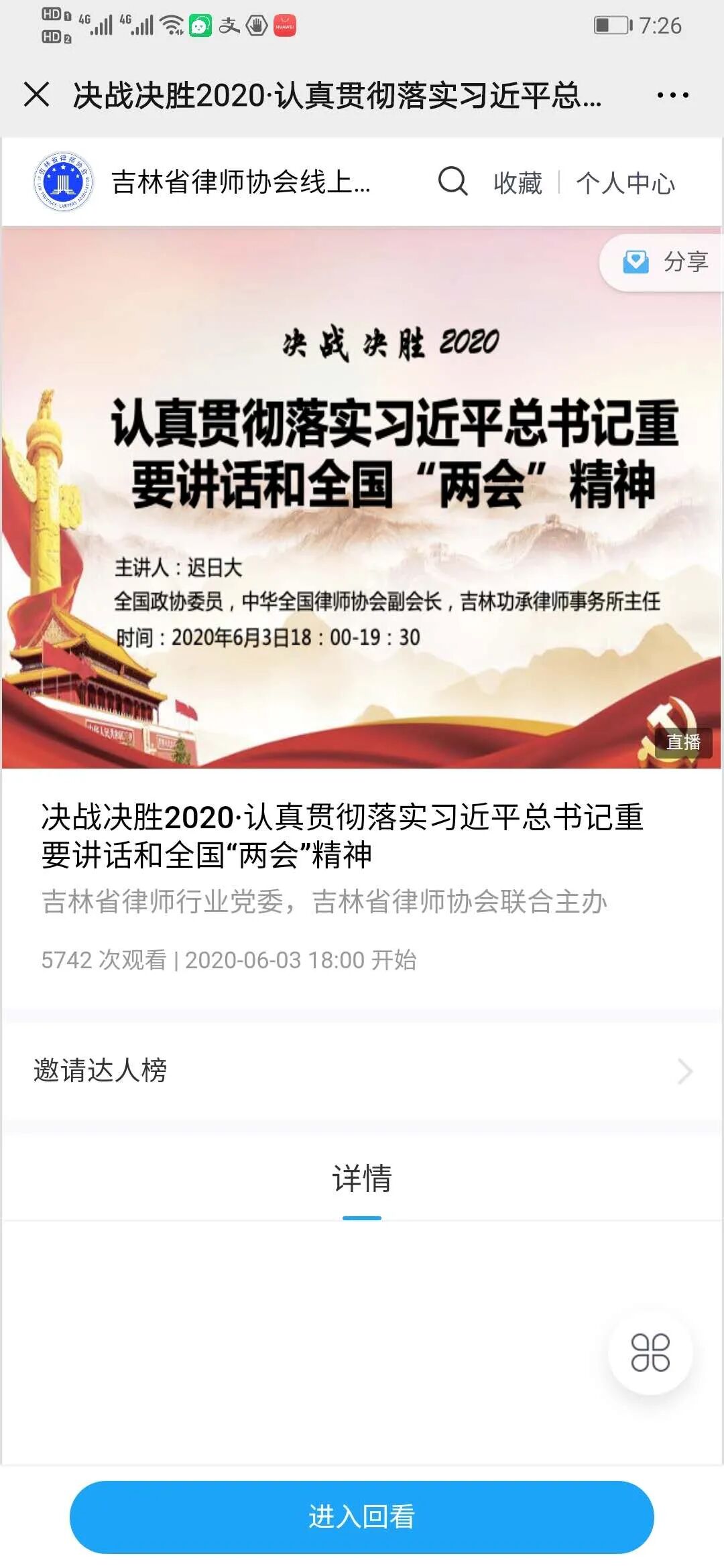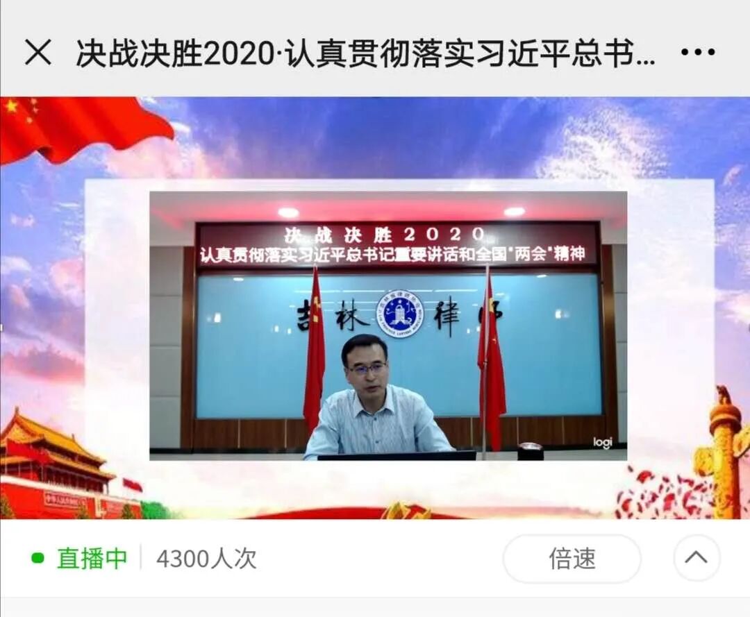 为认真学习贯彻十三届全国人大三次会议和全国政协十三届三次会议(以下简称“两会”)精神,6月3日,以“决战决胜2020”为主题的认真贯彻落实习近平总书记重要讲话和全国“两会”精神宣讲以线上直播的方式在省律师协会举行。吉林省律师行业党委特邀全国政协委员、中华全国律师协会副会长迟日大为全省律师管理干部、律师、实习律师、律师事务所行政辅助人员等进行“两会”宣讲。省律师行业党委专职副书记、省律师协会秘书长孙晓标主持宣讲。