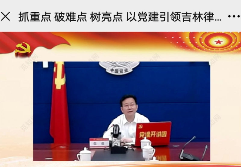 2020年7月8日,吉林省律师行业“党课开讲啦”活动正式启动,分设在全省9个市(州)的线上课堂同步互动,1600多名党员律师实时分享,拉开了全省律师行业党课开讲的序幕。省委组织部副部长、省非公党工委书记武胜国出席启动仪式并致辞。省司法厅党组书记、厅长张毅以“抓重点、破难点、树亮点,以党建引领吉林律师事业开创新篇章”为主题,为全省广大党员律师上了一堂生动深刻的党课。